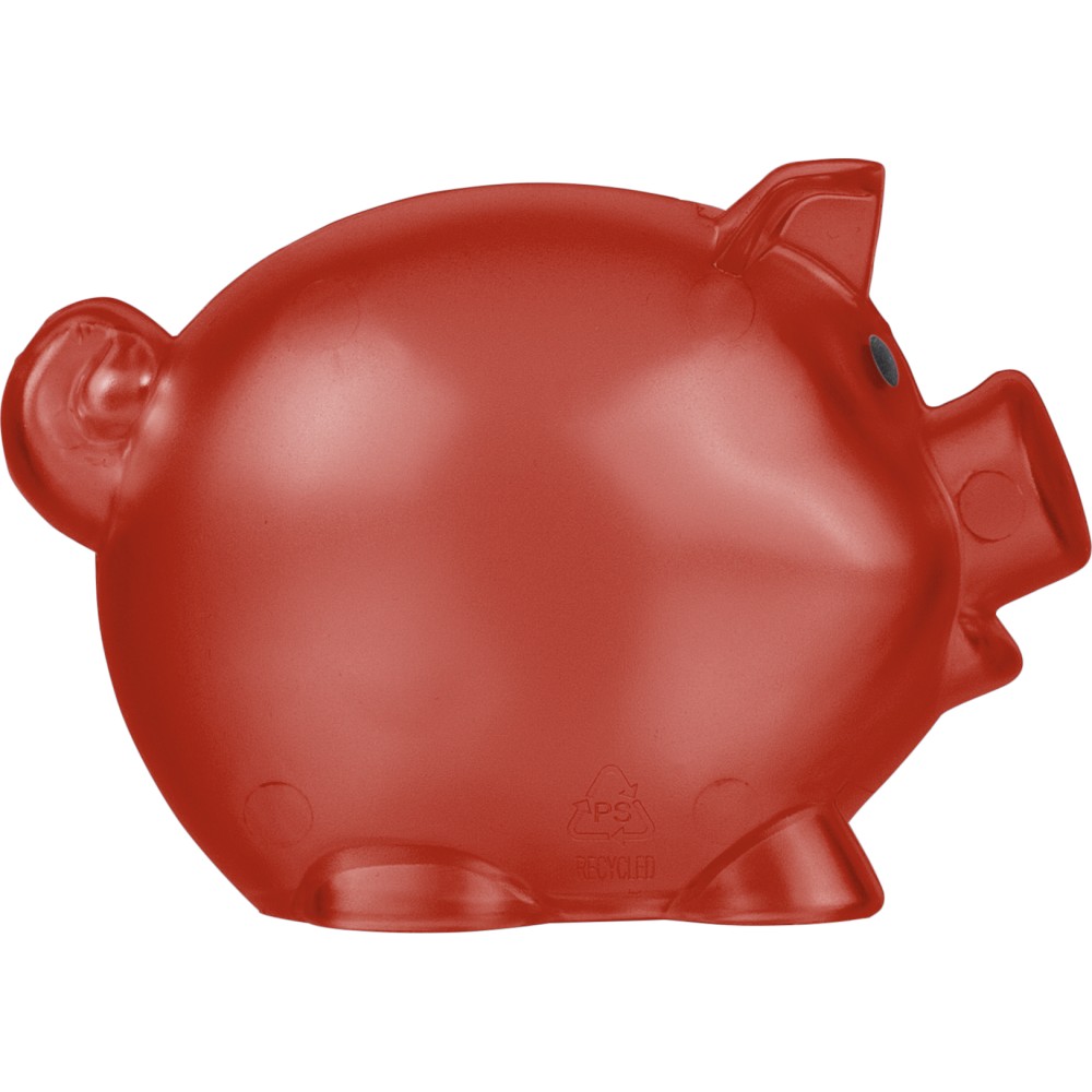 Újrahasznosított PS műanyagból készült, malacpersely. A hátoldalon recycled (újrahasznosított) alapanyagra utaló logó található.
