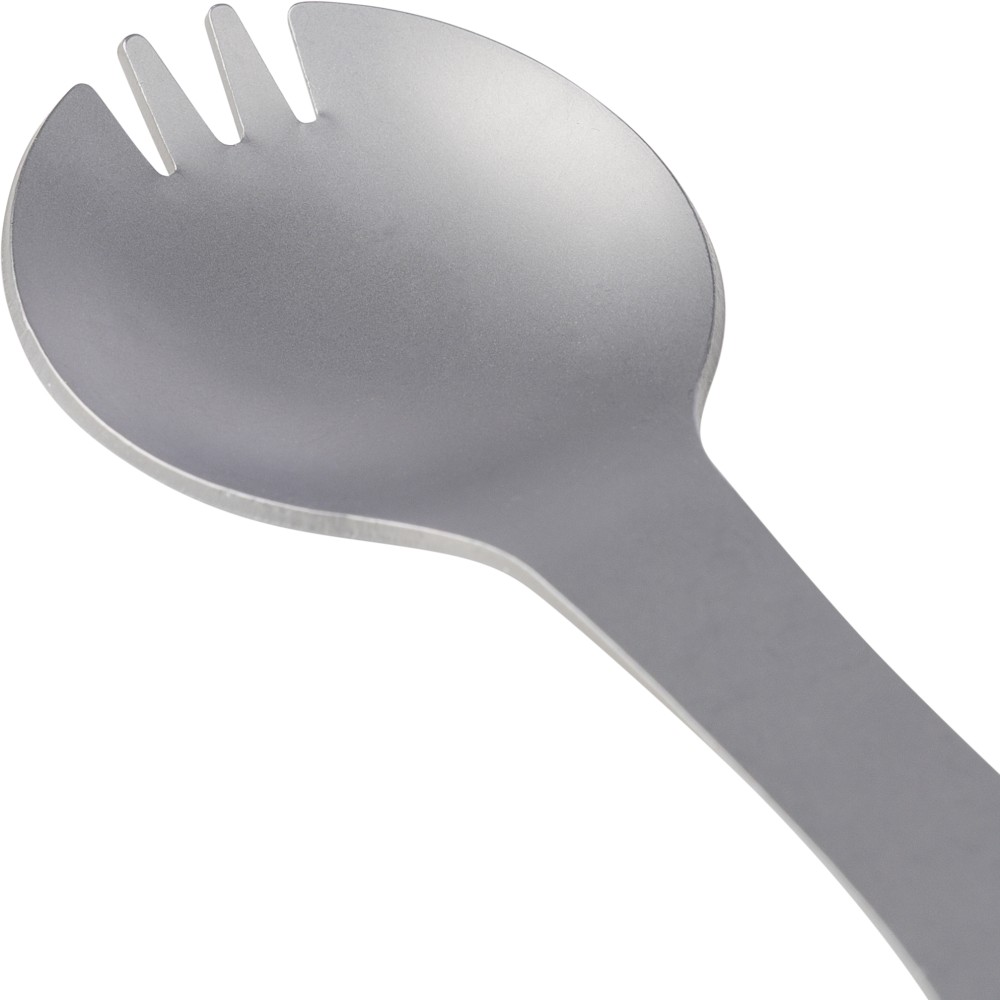 Rozsdamentes acélból készült spork (kanál - villa kombináció) integrált villával és kanállal, valamint beépített lapos csavarhúzóval, üveg- és konzervnyitóval, továbbá három hatlapú kulccsal a nyélben. Karabinerrel ellátva. Darabonként papírtasakba csomagolva.