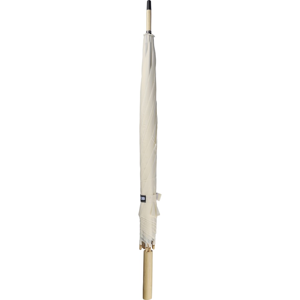 RPET 190T anyagból készült automata golfesernyő nyolc panellel és bambusz fogantyúval. Bambusz és acél szárra épülő fém vázzal rendelkezik, tépőzáras zárópánttal és rPET címkével ellátva.