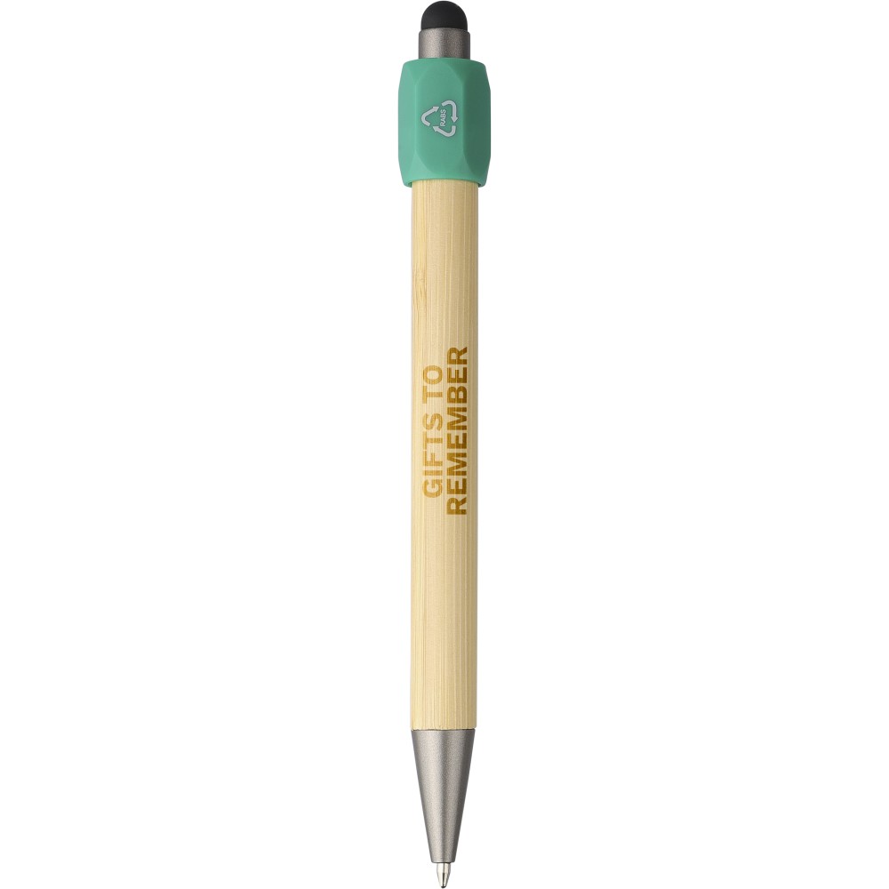 Bambusz golyóstoll újrahasznosított ABS pörgettyűvel és fekete érintővel a nyombógombon. A tollhegy vastagsága 1.0 mm, íráshossz: kb. 800 méter. Az újrahasznosított anyagra utaló logó a tollra van gravírozva.