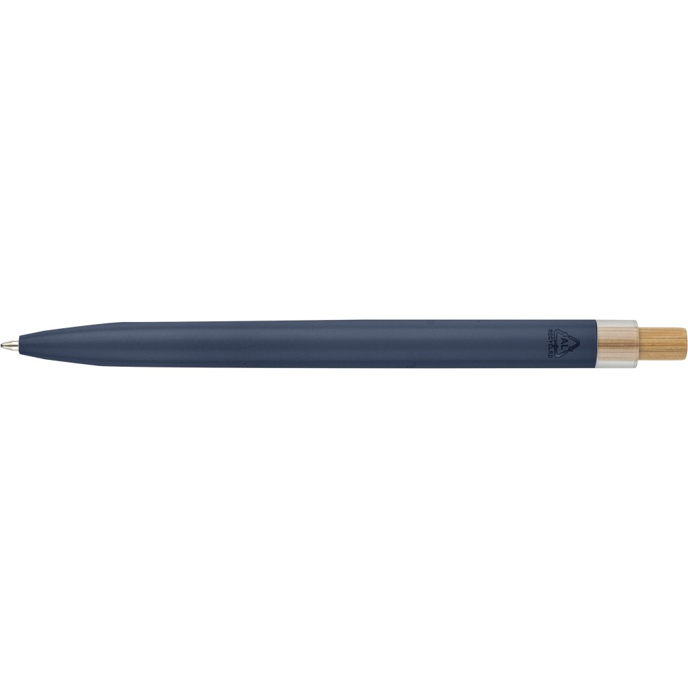 Újrahasznosított alumíniumból készült, lakkozott tollszett golyóstollal és rollerball tollal. A golyóstoll bambusz nyomógombbal, rPET díszítéssel és fém klippel rendelkezik, míg a rollerball toll bambusz/rPET kupakdíszítéssel és hozzá illeszkedő klippel. A tolltesten gravírozott recycled (újrahasznosított) alapanyagra utaló logó található mindkét toll esetében. A golyóstoll kb. 700 méter, a roller toll kb. 500 méter íráskapacitású, mindkettő kék színű tollbetéttel. Színes, újrahasznosított kartonból készült ajándékdobozba csomagolva.