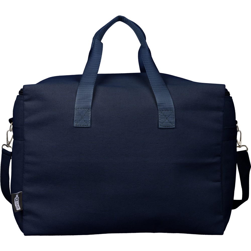 Újrahasznosított pamut-poliészter 330 g/m2 kevertszövetből készült hűtőtáska alumíniumfóliás szigeteléssel, 23 literes űrtartalommal. 60 cm hosszúságú és 3,5 cm szélességű fülekkel, 110 cm hosszúságú és 2,5 cm szélességű állítható vállpánttal, fémcsattal és a táska színével megegyező hevederrel rendelkezik. Külső felületén rPET címkével, belső részében további címkével ellátva.