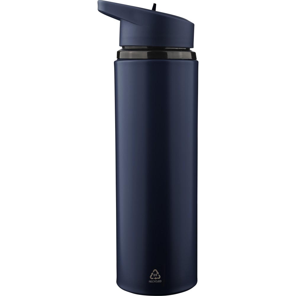 Újrahasznosított rozsdamentes acélból készült, egyfalú ivópalack rozsdamentes acél 304 anyagból, PP csavaros kupakkal, hordozófüllel, felhajtható ivószárral és belső szívószállal. Kizárólag hideg italokhoz használható, űrtartalma 500 ml. A palacktesten gravírozott recycled (újrahasznosított) alapanyagra utaló logó található. Darabonként barna kartondobozba csomagolva.