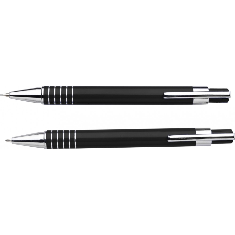 Lakkozott felületű golyóstoll fekete tollbetéttel és töltőceruza, színben hozzáillő dobozban.